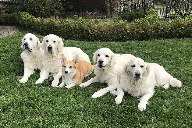 Die vierbeinige Familie unserer K-Welpen, v. l. Emma, Frieda, Knoppers, Jule und Mali, wünscht den Kleinen alles Gute und ein tolles Leben in ihren Familien!!!