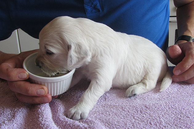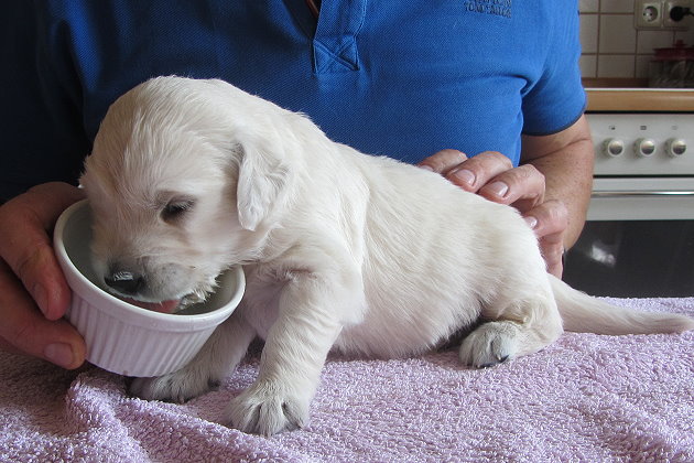 Hündin rot.   Der Anfang ist schwer, denn es gilt zu schlecken, statt zu saugen. Aber die Kleinen stellen sich schon ganz geschickt an.