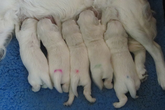 Die Welpen werden immer größer, wie man vor Jules Gesäuge deutlich sehen kann - hier die Jungs.