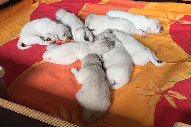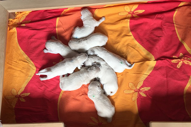 Inzwischen haben alle acht Welpen ihre Geburtsgewichte mehr als verdoppelt und es wird enger an Jules Gesäuge. Damit wir sicher sind, dass jeder Welpe seine Milchmenge erhält, haben wir sie in zwei Säugegruppen für jede Seite eingeteilt. Hier trinken die ersten Vier an der rechten Gesäugeseite .....