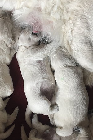 Inzwischen sind die Augen geöffnet und die Welpen reagieren auf Aktivitäten vor der Wurfkiste. So wird es Zeit für die nächsten Einzelaufnahmen mit "Schlafzimmerblicken"!