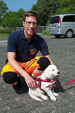 Buddy mit Arndt beim Welpentraining. Angst vor fremden Untergründen hat der Kleine nicht!