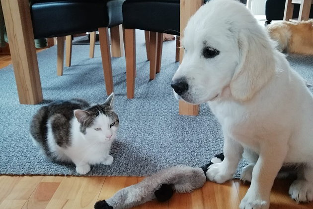 Im neuen Zuhause gibt es für Hugo erstmal die Lieblingsmahlzeit und ein interessantes Spielzeug.