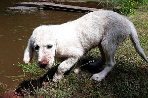Auch Iloy mag offensichtlich das matschige Gelände und weicht keiner Pfütze aus.
