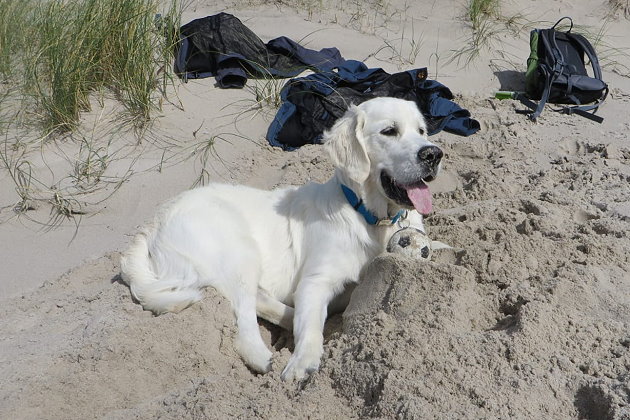 Einen schattigen Buddelplatz hat Hugo auch schon gefunden.