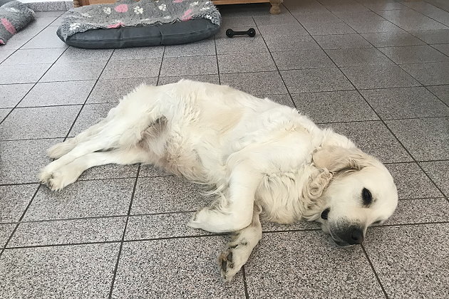 Im Haus liegt Frieda schon deutlich mehr als sonst - bekommt